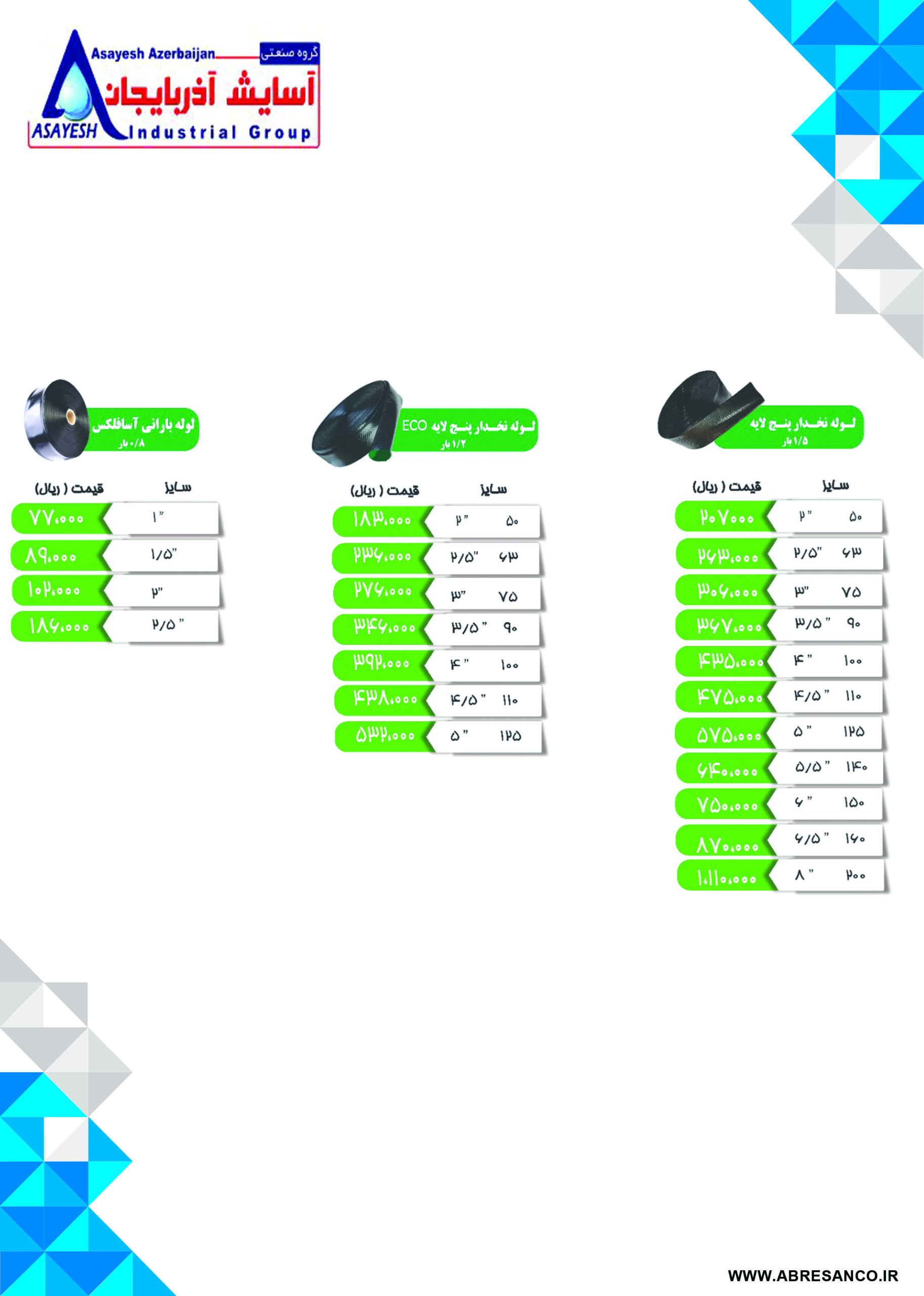 تولید ، فروش و توزیع انواع لوله های پلی اتیلن ، نوار تیپ ، لوله های نخدار ، اتصالات پلی اتیلن ، انواع لوله های قطره ای ، انواع نتافیم و قطره های خارجی ، آبپاش ، شیرتوپی ، شیر فلکه ، انواع رینگ و فلنج ، اتصالات دنده ای ، اتصالات گالوانیزه و پلیمری ، تفلون، انواع رایزر پلیمری و فلزی ، انواع شیر خودکار.